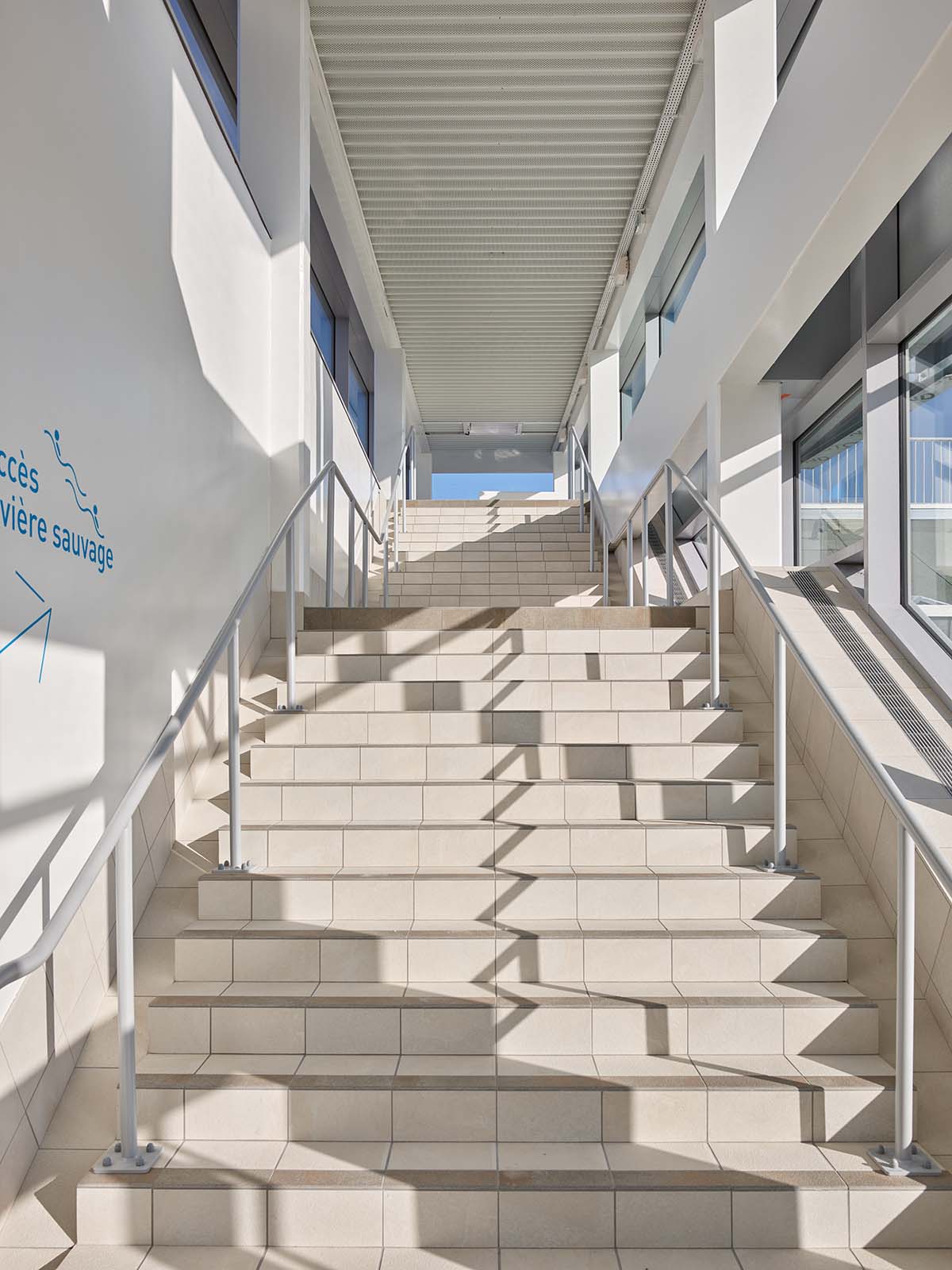 Le Centre aquatique de Dol-de-Bretagne a pour vocation d’accueillir le public dans un espace ludique, mais aussi les scolaires pour l’apprentissage de la nage. L’ensemble des locaux fonctionnels qui s’articulent autour du hall d’accueil sont contenus dans un volume rectangulaire recouvert d’une peau de béton matricé et d’une toiture végétalisée. En partie centrale de ce volume, la peau béton s’interrompt pour laisser se développer l’espace du hall d’accueil et l’espace administratif. Ce socle qui règne en altimétrie avec les égouts des bâtiments avoisinants laisse émerger en deuxième plan le volume des bassins. Cette émergence largement vitrée en façade assure le bon ensoleillement des plages et des bassins intérieurs et confère à cet espace ouvert sur la nature une qualité ludique et une atmosphère adaptée à la détente et aux sports de loisirs. Signal symbolique visuel du projet aquatique, la rivière sauvage et le volume accompagnant son accès occupent l’angle Sud-Est du bâtiment. En situation de belvédère, le plus haut volume de l’équipement offre un panorama sur la ville de Dol de Bretagne, Il officie ainsi d’impact visuel, immédiat et lointain, caractérisant la piscine tout en s’y intégrant naturellement dans un équilibre paysagé respecté. En partie Sud, le volume abritant les plans d’eau se creuse en son centre suivant une géométrie courbe qui en dessine la périmètrie. Cet évidemment dévoile le volume de moindre hauteur de l’espace forme/détente situé au coeur de l’équipement, une géométrie douce vient identifier également l’espace de la pataugeoire protégé des autres plans d’eau. Dialoguant avec le dessin du paysage existant, le volume simple du bâtiment vient ponctuellement se courber, cette géométrie douce vient marquer les espaces plus protégés de la piscine telle la pataugeoire et l’espace forme/détente.
