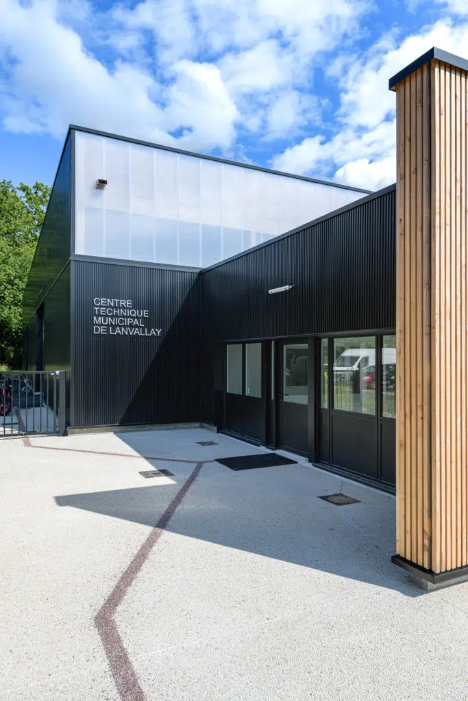 Ce bâtiment du Centre Technique Municipal de Lanvallay est situé au Sud-Est de la commune, sur une parcelle de 6032 m². Il remplace une construction existante qui est déposée pour faire place à ce projet. Le site comprend trois bâtiments distincts et un auvent, avec une conception harmonieuse intégrant des éléments modernes et respectueux de l’environnement, notamment grâce à l’installation de panneaux photovoltaïques. La topographie du terrain, avec un dénivelé d’environ 2,50 mètres, a été légèrement remaniée pour faciliter l’implantation des structures et assurer une meilleure fonctionnalité. Un chemin piéton arboré qui relie la parcelle à la rue des Landes de Bellevue, prolongé sur la partie Est du terrain est créé. Les bâtiments sont conçus pour respecter l’alignement existant, tout en séparant efficacement les espaces techniques, de service et d’habitation. La façade Est du bâtiment administratif est en bardage bois naturel, tandis que les autres structures arborent des revêtements métalliques noirs, en cohérence avec l’environnement architectural. Des espaces verts, notamment des plantations d’arbres, complètent l’aménagement pour respecter les exigences du PLU, qui impose au moins 30 % de la surface en espaces verts. Le site est également doté de parkings intérieurs et extérieurs, avec des accès bien organisés pour optimiser la circulation des véhicules du public et des travailleurs. En somme, ce projet s’inscrit dans une démarche d’intégration paysagère et fonctionnelle, visant à offrir un équipement moderne, pratique et respectueux de son environnement.