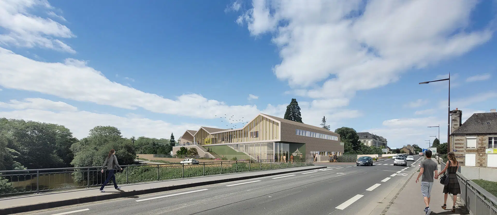 L’architecture se veut singulière, avec une façade en bardeaux de bois évoquant le Mont-Saint-Michel, et des façades d’entrée en carreaux émaillés verts. L’espace d’accueil, face au fleuve, est ouvert et convivial, avec des terrasses et des brises soleils pour le confort estival. La partie arrière, plus sobre, utilise un enduit minéral et des ouvertures horizontales pour maximiser la lumière naturelle.